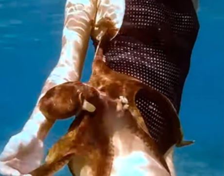 Cuando la joven intentó sacar el molusco de su cuerpo, este se rehusaba a soltarse. Prácticamente, el enorme pulpo estaba desde la cintura hasta su muslo y sus tentáculos rodean todo ese tronco.