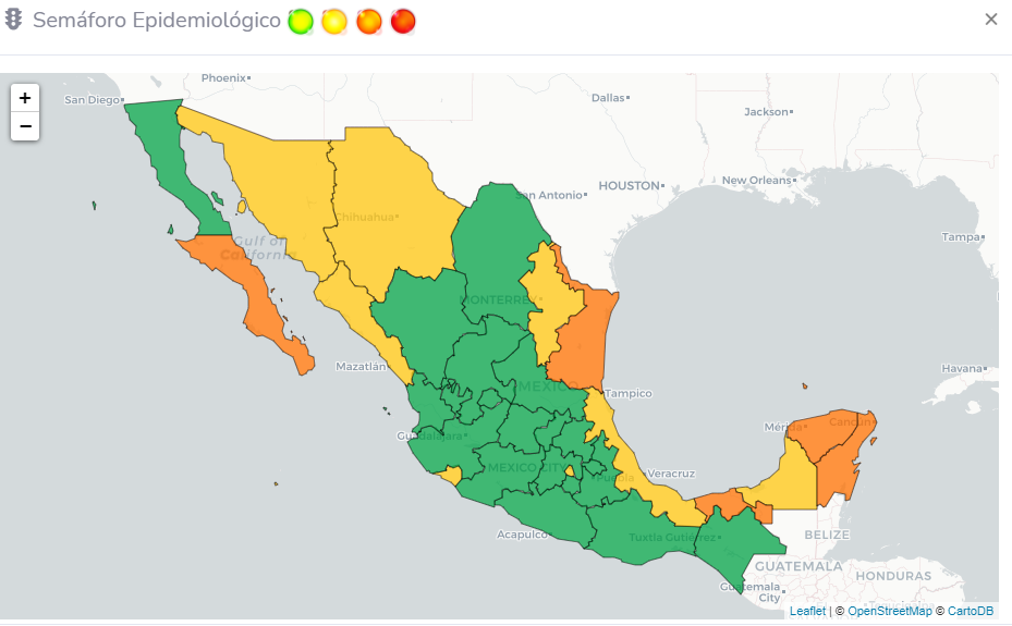 Mientras que, en naranja están: Baja California Sur, Nuevo León, Tamaulipas, Nayarit, Jalisco, Colima, Guerrero, Oaxaca, Estado de México, Ciudad de México, Hidalgo, Veracruz y Quintana Roo.