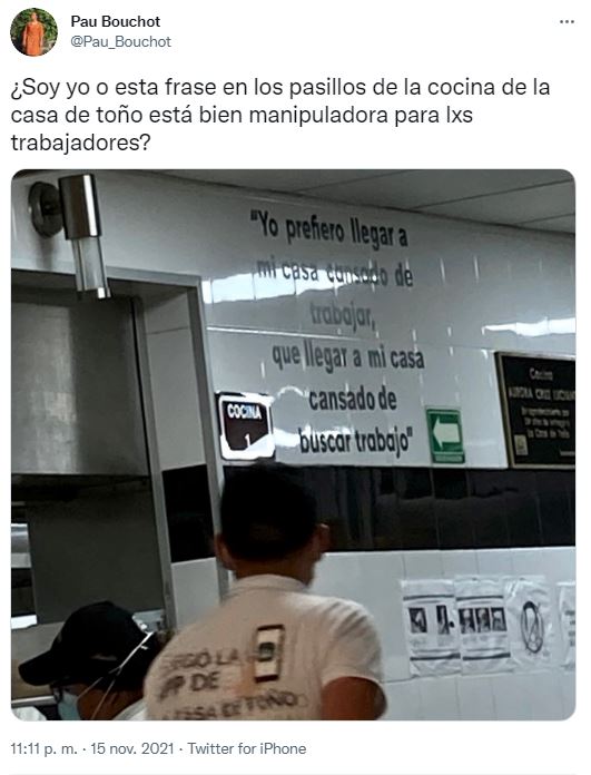 Soy yo o ésta frase en los pasillos de la cocina de la Casa de Toño está bien manipuladora para lxs trabajadores?”, pregunta Pau en su hilo en Twitter.