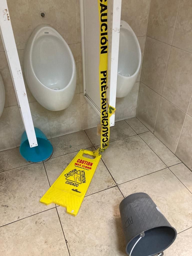 Uno de los mingitorios estaba fuera de servicio, con una cinta de precaución; misma que fue arrancada. También charcos de líquido se encontraban en el piso.