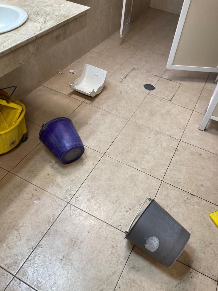 En el baño de hombres, los trapeadores, escobas y el dispensador de papel fueron destruidos. También fueron tiradas cubetas, y señalamientos de “precaución piso mojado”.