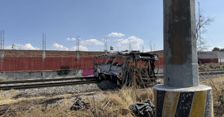 A mitad de las vías y completamente consumido por las llamas, se encontró el camión de transporte de personal, el cual quedó en pérdida total.