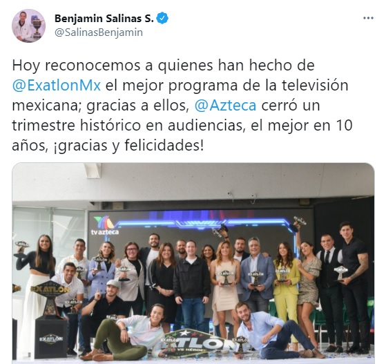 Hoy reconocemos a quienes han hecho de @ExatlonMx el mejor programa de la televisión mexicana; gracias a ellos, @Azteca cerró un trimestre histórico en audiencias, el mejor en 10 años, ¡gracias y felicidades”, expresó el directivo en la red social.