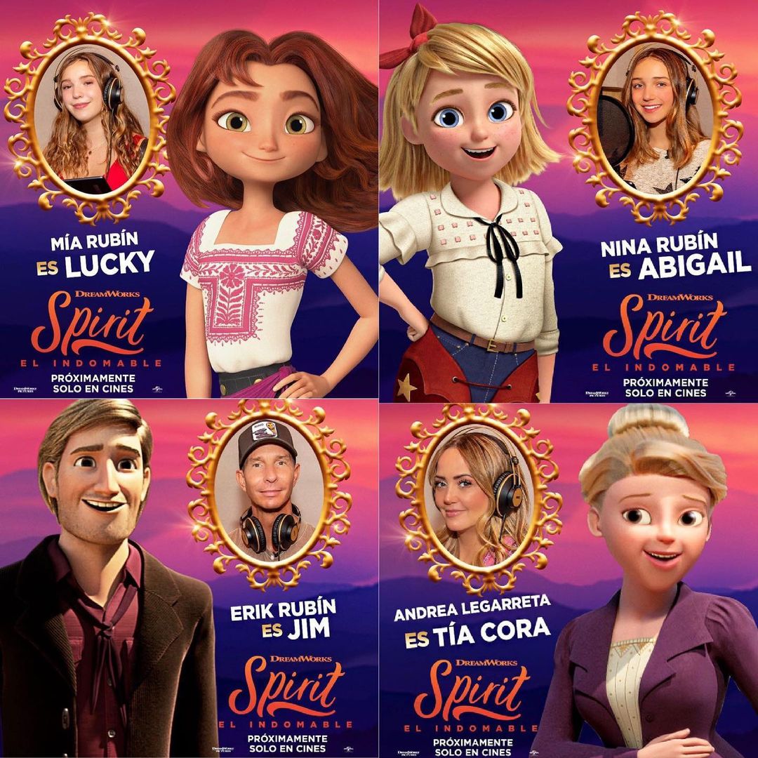 “Spirit, el indomable” es una película de aventuras animada por computadora estadounidense de 2021 producida por DreamWorks Animation y distribuida por Universal Pictures, donde las voces en español estuvieron a cargo de Mía Rubín en el papel de Lucky, Nina es Abigail, Erik Rubín dobló a Jim y Andrea Legarreta le dio voz a la tía Cora.