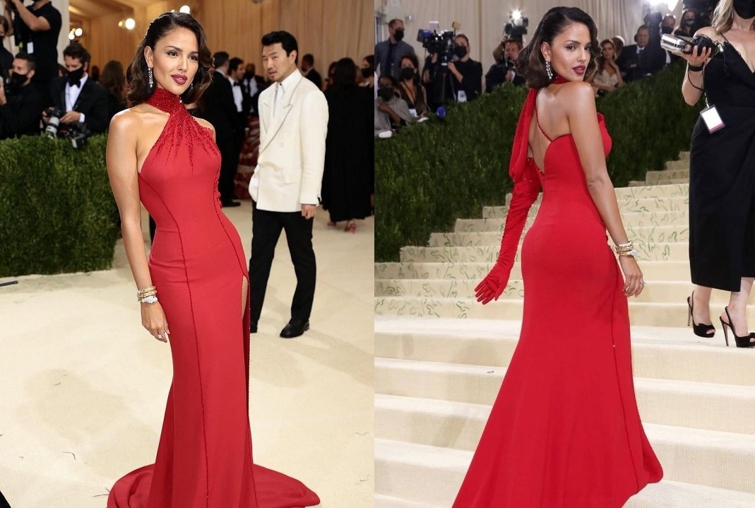 (Mi vestido) es de Donatella Versace y quería tener algo como de Rita Hayworth, tener esa vibra del glamour de Hollywood, pero con un twist mexicano”, dijo Eiza a su llegada a la Gala del Museo Metropolitano de Arte en Nueva York.
