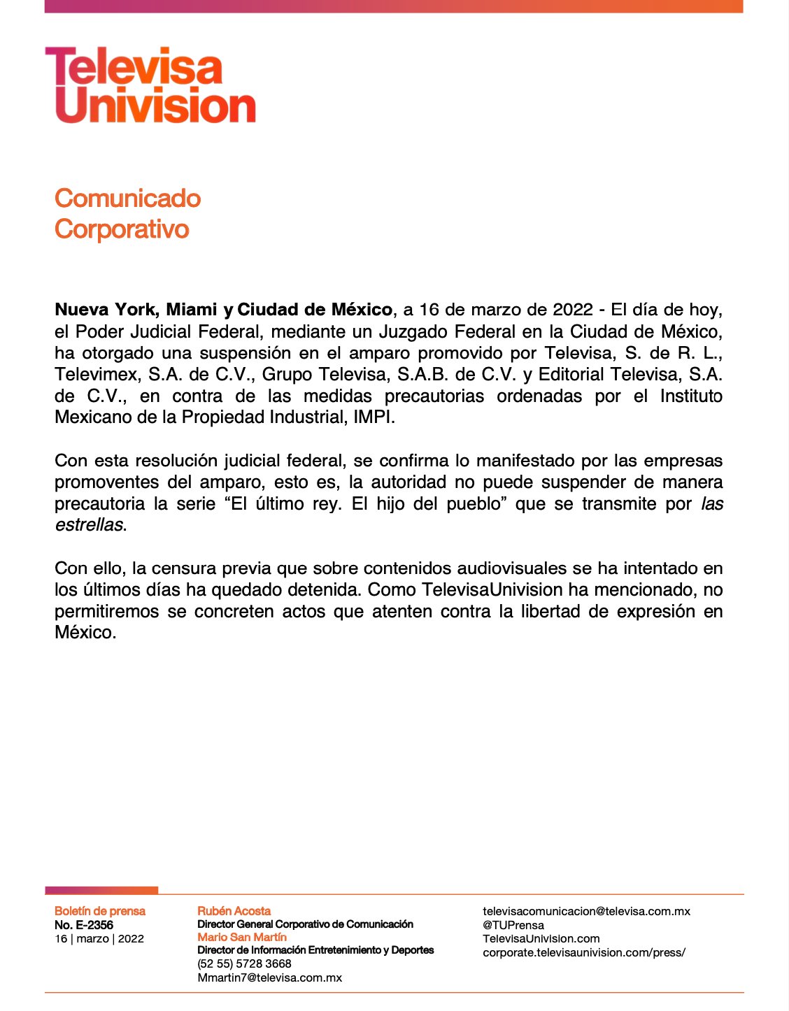 Este miércoles, el Poder Judicial Federal, mediante un Juzgado Federal en la Ciudad de México, ha otorgado una suspensión en el amparo promovido por Televisa, S. de R. L., Televimex S.A. de C.V. Grupo Televisa, S.A.B de C.V. y Editorial Televisa, S.A. de C.V., en contra de las medidas precautorias ordenadas por el Instituto Mexicano de la Propiedad Industrial, IMPI”.