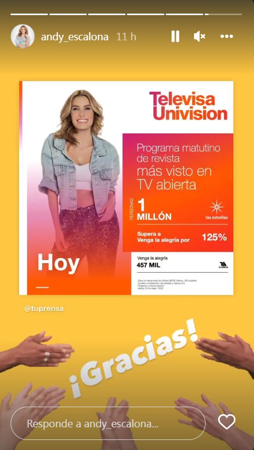 Ahora, este logro lo presumió en sus redes sociales la reconocida hija de Magda Rodríguez, sobrina de la productora de la emisión, pues a través de las historias de su cuenta de Instagram donde compartió una imagen, en la cual se le ve muy sonriente sobre un fondo blanco y unas letras anaranjadas, en el que plasma que Hoy es el programa más visto por televidentes mexicanos, superando a Venga la Alegría.