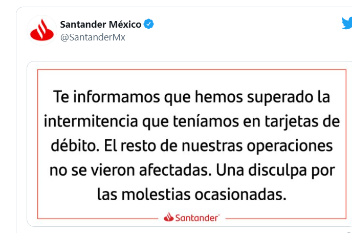 Después de una hora de haberse presentado las fallas, Santander México informó que a las 17:00 horas fue restablecido su servicio con lo que superó la intermitencia para utilizar sus tarjetas.