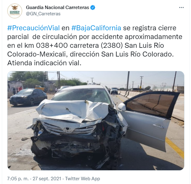 Precaución Vial en Baja California se registra cierre parcial de circulación por accidente aproximadamente en el km 038+400 carretera (2380) San Luis Río Colorado-Mexicali, dirección San Luis Río Colorado. Atienda indicación vial”, se puede leer en Twitter.