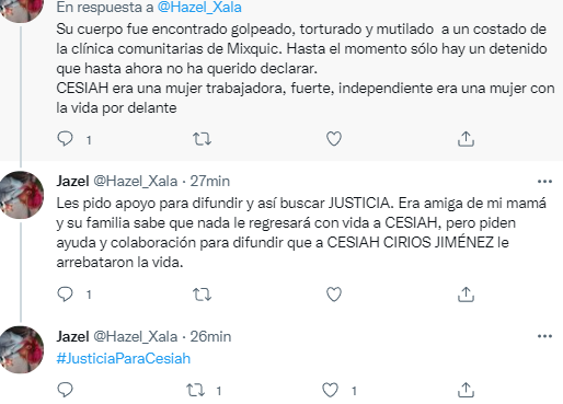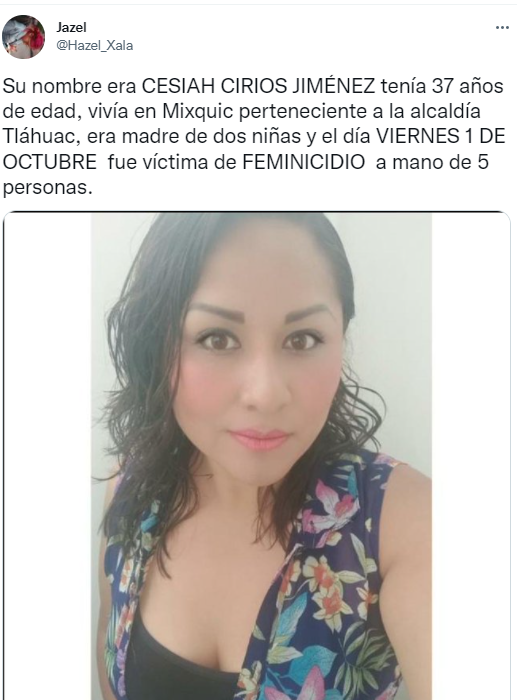 CESIAH era una mujer trabajadora, fuerte, independiente. Tenía su negoció propio. CESIAH era una mujer con la vida por delante. Les pido apoyo para difundir y así buscar JUSTICIA. Era amiga de mi mamá y SU FAMILIA sabe que nada le regresará con vida a CESIAH”, escribió el usuario.