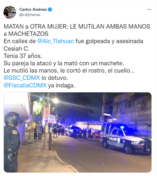 MATAN a OTRA MUJER; LE MUTILAN AMBAS MANOS a MACHETAZOS. Su pareja la atacó y la mató con un machete. Le mutiló las manos, le cortó el rostro, el cuello&”, escribió el periodista en Twitter.
