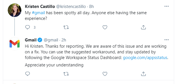 La cuenta oficial de Gmail en Twitter ha respondido a algunos usuarios que reportan estas fallas, sin embargo, los asesores informan que todo está bien.