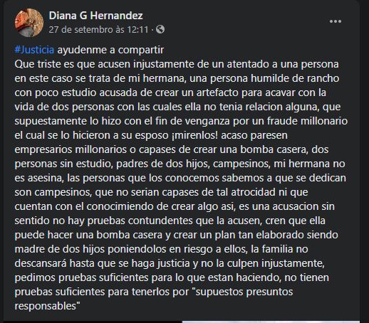 ¡Mirenlos! acaso parecen empresarios millonarios o capaces de crear una bomba casera, dos personas sin estudio, padres de dos hijos, campesinos, mi hermana no es asesina”, escribió la hermana de Georgina.