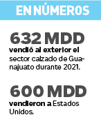 “En 2021 se tuvo un aumento (en las exportaciones de calzado en Guanajuato) del 32 % en relación a 2020, lo que significó ventas por 632 millones de dólares. Estados Unidos es el socio comercial número 1, con 600 millones de dólares de exportación, sin pasar por alto otros países de América como Guatemala y Colombia”, compartió Daniel Sepúlveda, gerente general de Comercio Exterior de la Ciceg.