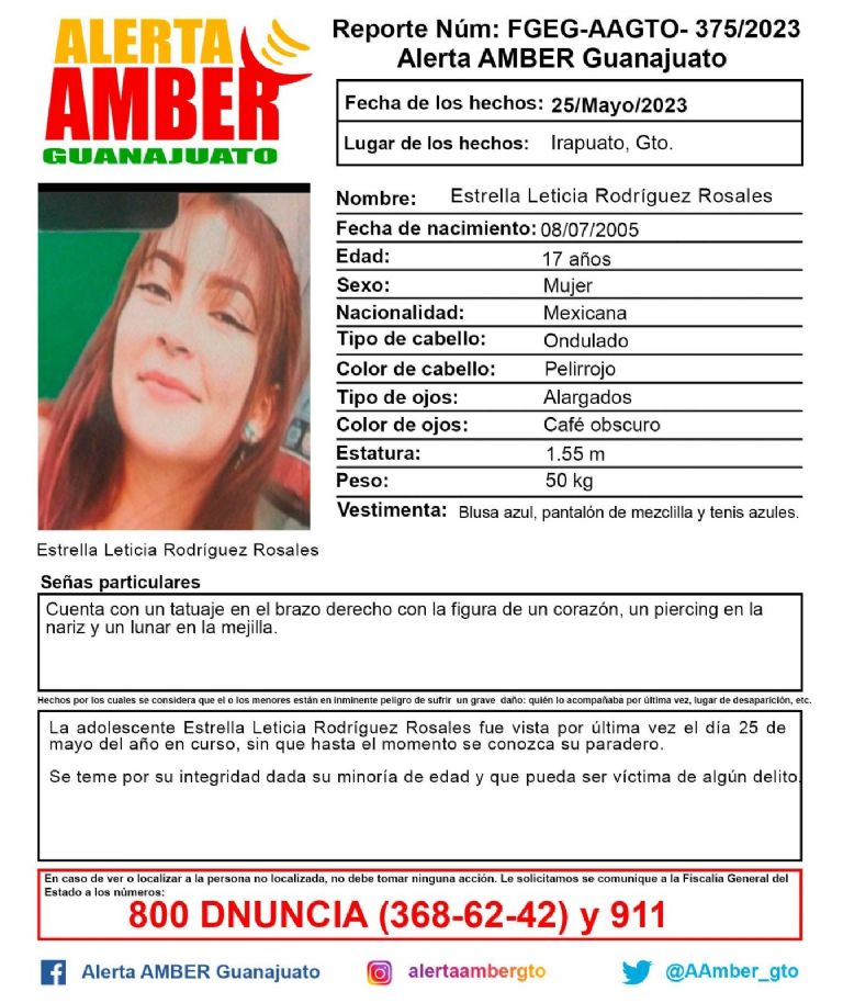 Irapuato, Guanajuato.- En las últimas horas, la Fiscalía General del Estado informó sobre la activación de la Alerta Amber Guanajuato de la adolescente Estrella Leticia Rodríguez Rosales, de 17 años, desaparecida en Irapuato.