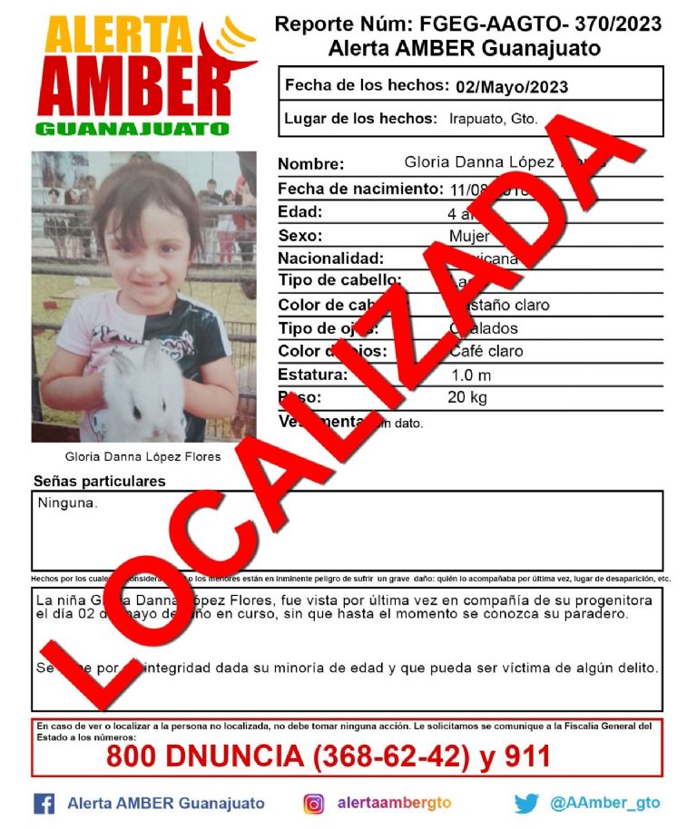 Por otra parte, la autoridad ministerial en Guanajuato informó que tras 23 días de no saber de su paradero, la menor Gloria Danna López Flores, de 4 años, por quien fue activada la Alerta Amber, fue localizada.