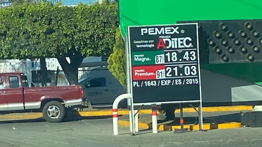 Por el mismo Torres Landa otra gasolinera de Pemex ofrece la regular en $18.43 y la premium en $21.03, por lo que los consumidores hacen fila.