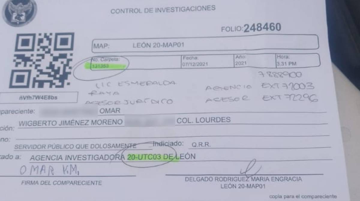 La familia Vega acudió a la Fiscalía General del Estado a interponer la denuncia en contra de los elementos de la Policía Municipal, la cual quedó canalizada en el área de la Agencia Investigadora 20-UTC03 de León, bajo el número de carpeta de investigación 131353.