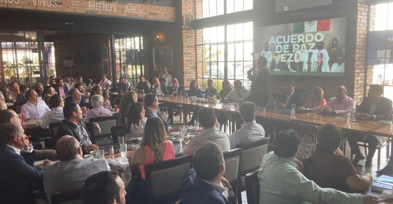 En su gira por Guanajuato el político hizo una parada para comer en La Parrilla de Davino, en el outlet Factory Shops, de León, para escuchar y hablar ante más de un centenar de empresarios. A su izquierda se sentó el capitán de Grupo Flexi, Roberto Plasencia Torres.