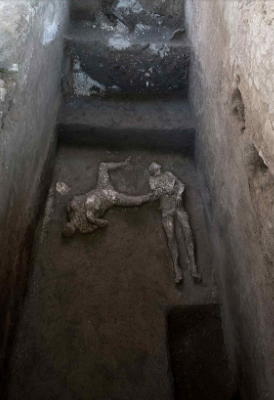 Italia.– Los restos de lo que se cree que fue un hombre rico y su esclavo que intentaban escapar de la muerte de la erupción del Vesubio fueron descubiertos por arqueólogos en Pompeya.