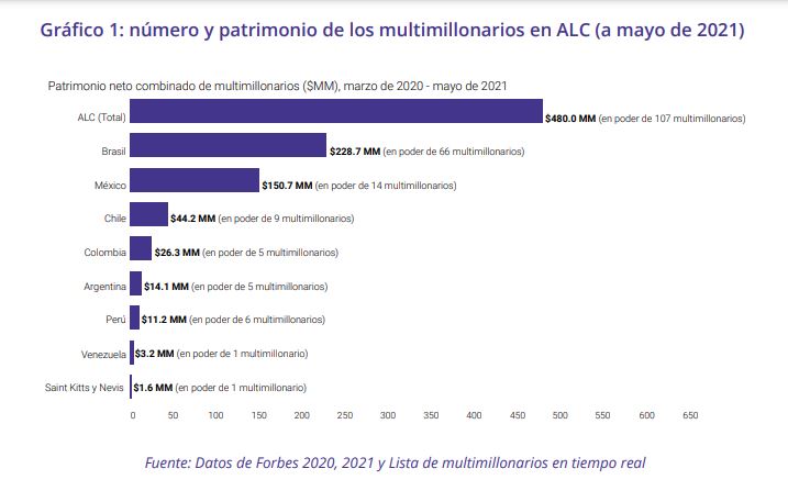 El medio refiere que de acuerdo a datos analizados por Latindadd y actualizaciones en tiempo real de Forbes, hasta mayo de 2021, existían 107 personas multimillonarias y en conjunto acumularon 480 mil millones de dólares.