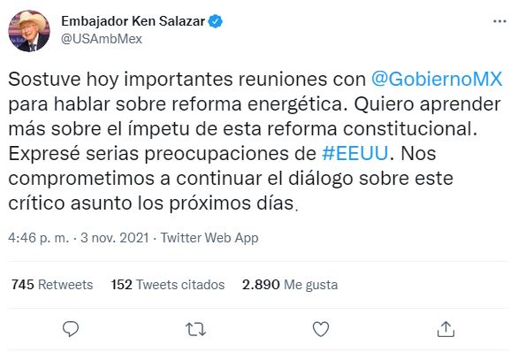 Ciudad de México.- En un mensaje publicado en su cuenta de Twitter, el embajador de Estados Unidos en México, Ken Salazar, expresó las “serias preocupaciones” de su país sobre la reforma eléctrica que se impulsa desde Palacio Nacional.