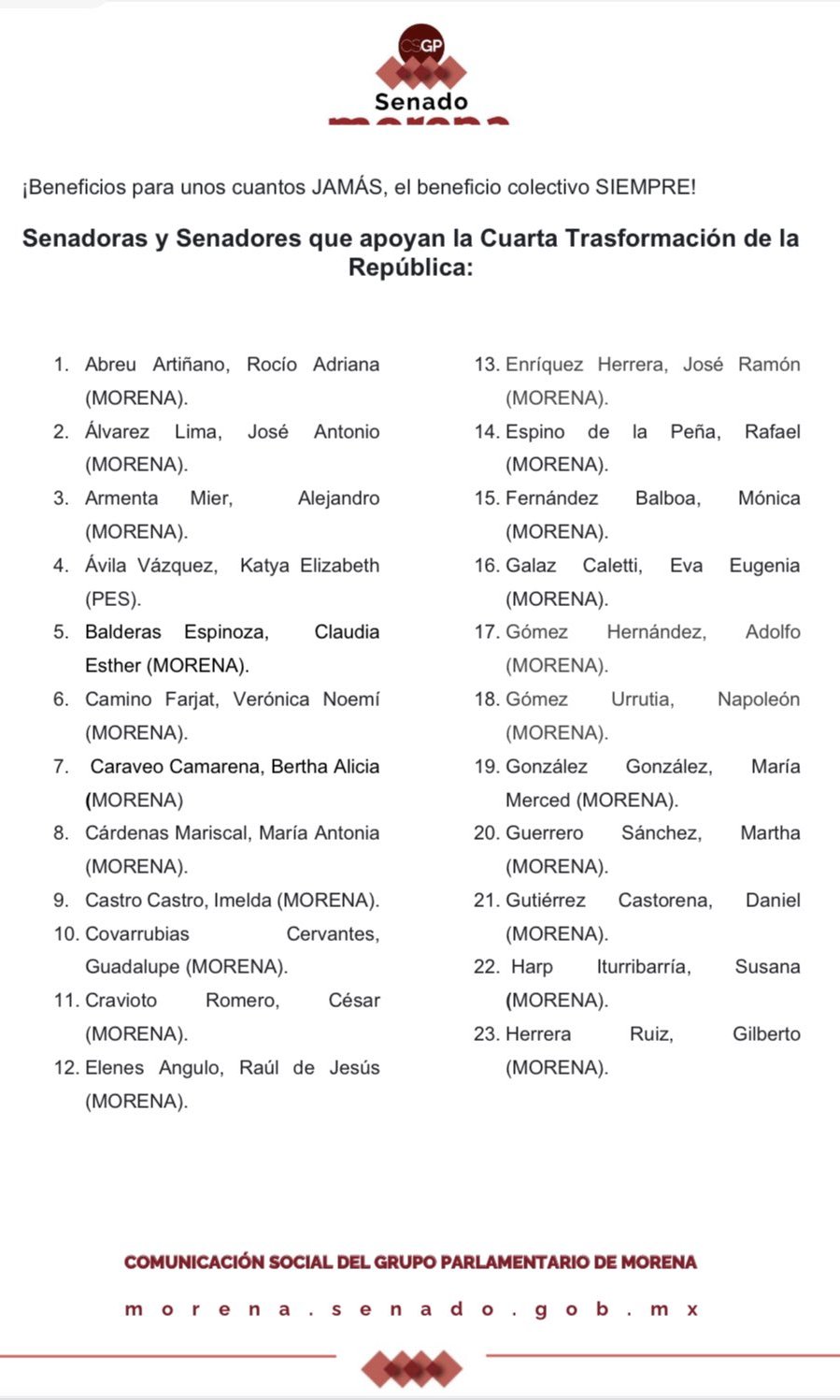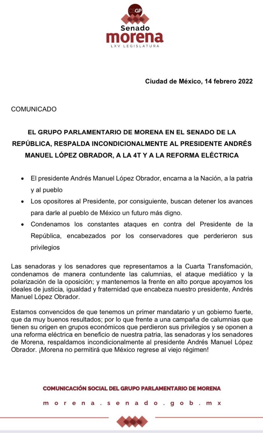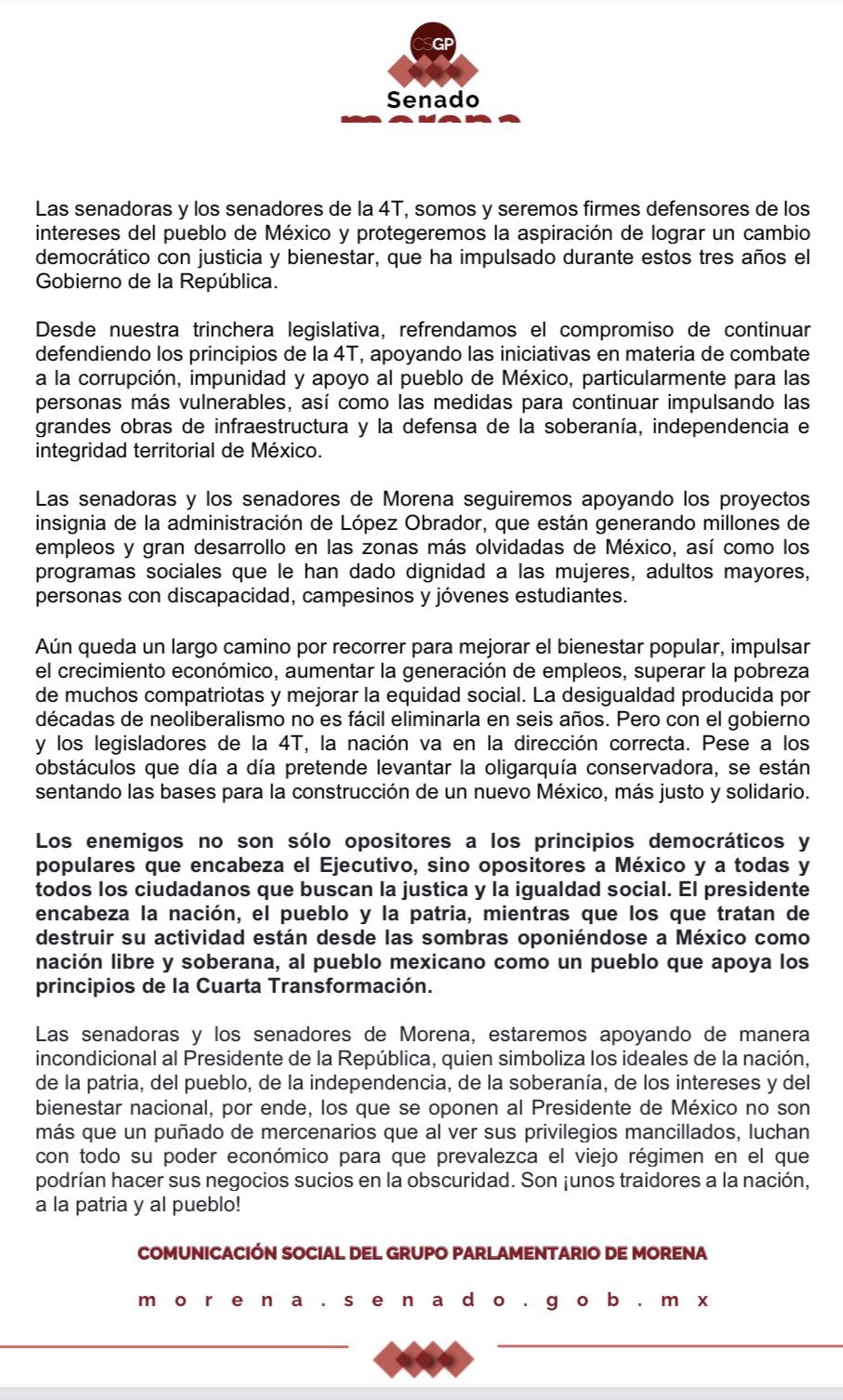 En la misiva, los senadores morenistas condenan los ataques y calumnias contra el Presidente de México, aunque no mencionan el escándalo de la llamada “Casa Gris”, es decir, de las mansiones de José Ramón López Beltrán en Houston, que ha destapado un posible conflicto de interés entre una empresa petrolera y el hijo del Presidente AMLO.