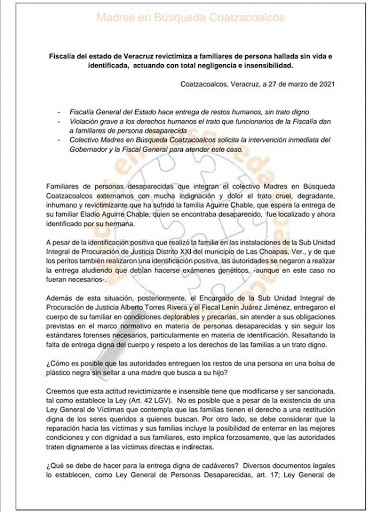 Se han iniciado las investigaciones para establecer las responsabilidades administrativas y se ha aperturado la carpeta de investigación FGE/FIM/16/2021 para fincar las probables responsabilidades penales en contra de servidores públicos que violentaron la Ley General de Víctimas y los protocolos homologados de búsqueda e investigación”, se puede leer en el comunicado.