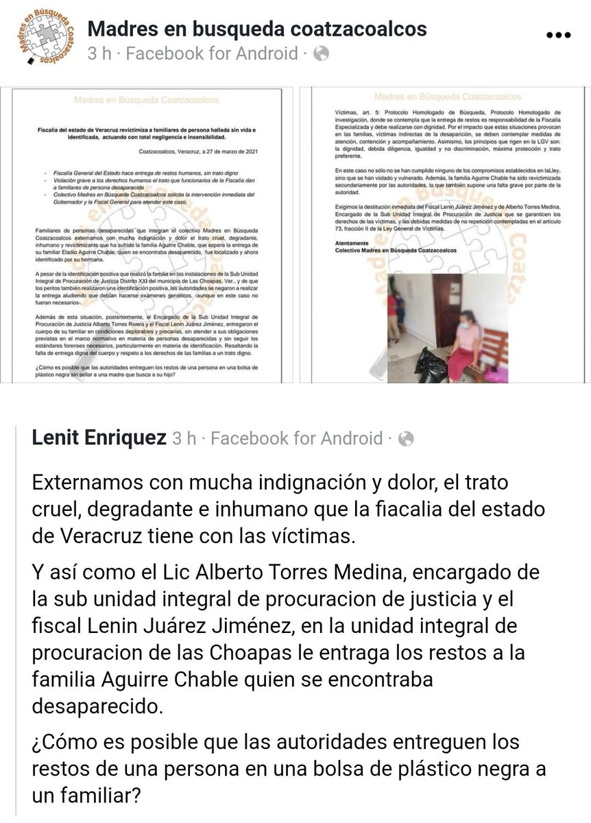 ¿Cómo es posible que las autoridades entreguen los restos de una persona en una bolsa de plástico negra sin sellar a una madre que busca a su hijo?”, denunció el Colectivo Madres en Búsqueda Coatzacoalcos.