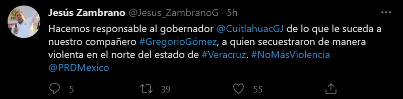El líder del PRD nacional, Jesús Zambrano, responsabilizó al gobernador Cuitláhuac García de lo que le pasé a Gregorio Gómez. “A quien secuestraron de manera violenta en el norte del estado de Veracruz”, afirmó.