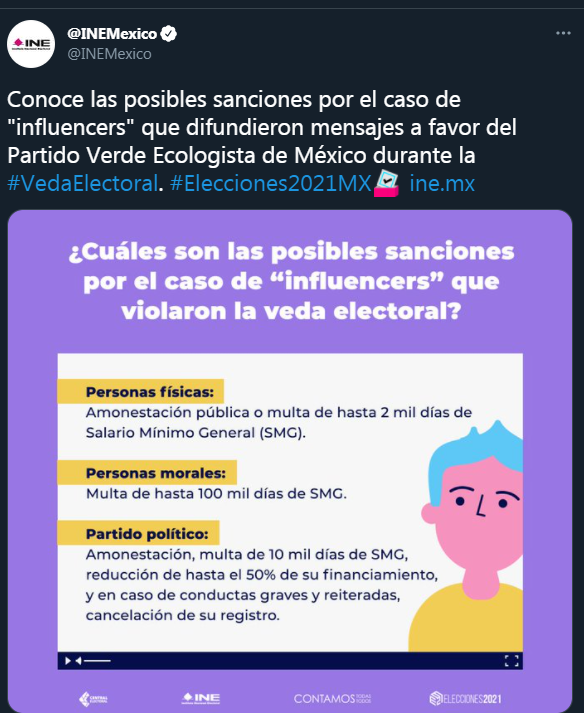 Conoce las posibles sanciones por el caso de “influencers” que difundieron mensajes a favor del Partido Verde Ecologista de México durante la #VedaElectoral. #Elecciones2021MX http://ine.mx”, se puede leer en Twitter.