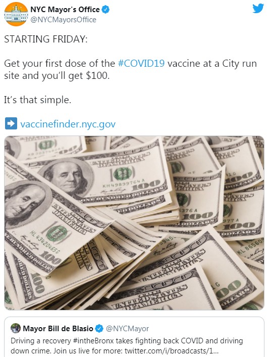 Les agradecemos, les decimos que estamos muy contentos de que se hayan vacunado, por su propio bien, por el bien de su familia, por el bien de su comunidad, y les daremos 100 dólares para agradecerles por haber hecho lo correcto, y para incentivar a la gente”, señaló el alcalde de Nueva York.