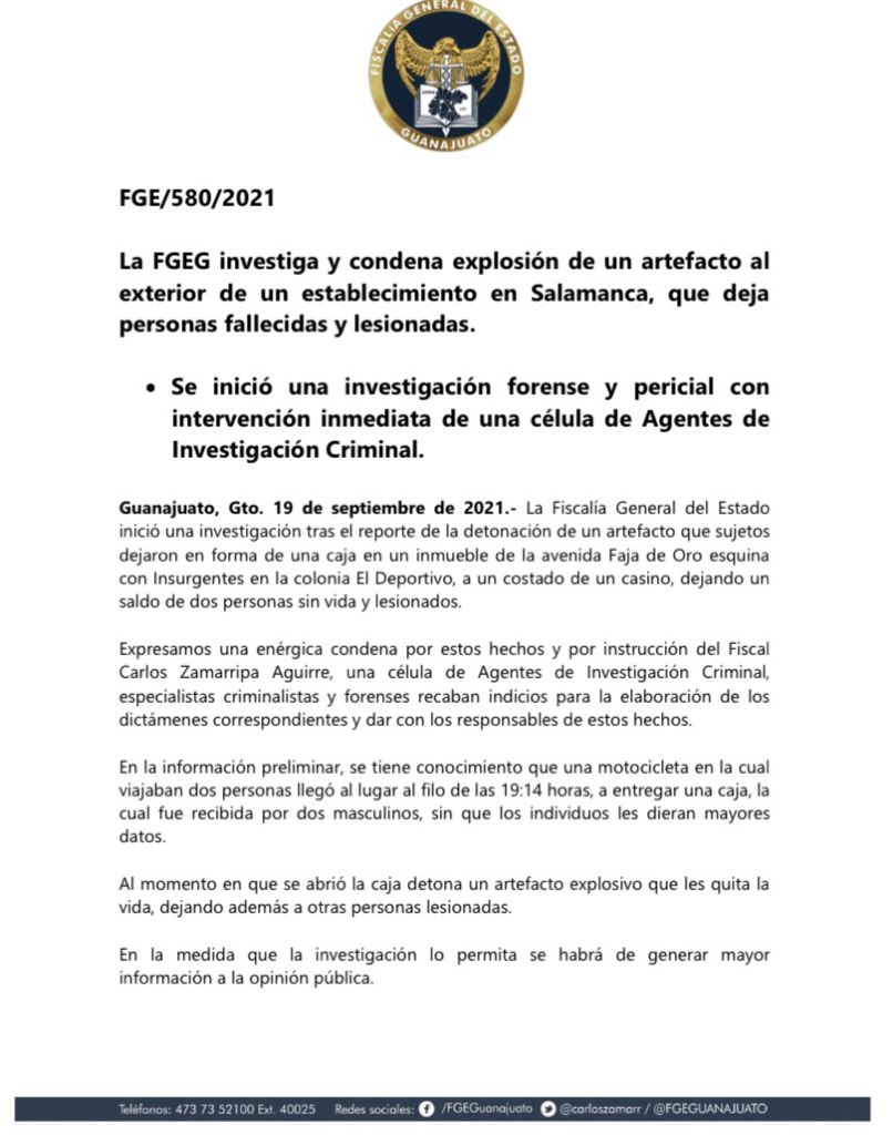 Por medio de un comunicado oficial, la Fiscalía del Estado informó que “inició una investigación tras el reporte de la detonación de un artefacto que hombres dejaron en forma de una caja en un inmueble de la avenida Faja de Oro esquina con Insurgentes en la colonia El Deportivo, a un costado de un casino, dejando un saldo de dos personas sin vida y lesionados”.