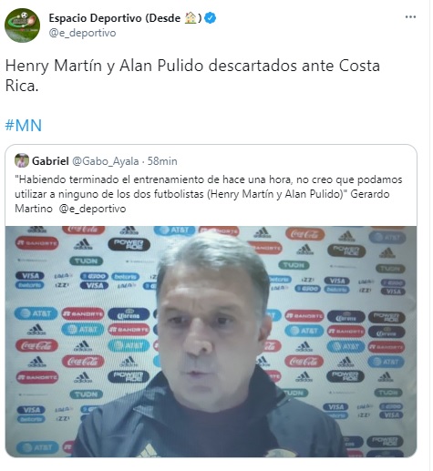 “Habiendo terminado el entrenamiento de hace una hora, no creo que podamos utilizar a Henry Martín ni a Alan Pulido”, comentó Martino en la conferencia que ofreció este lunes.