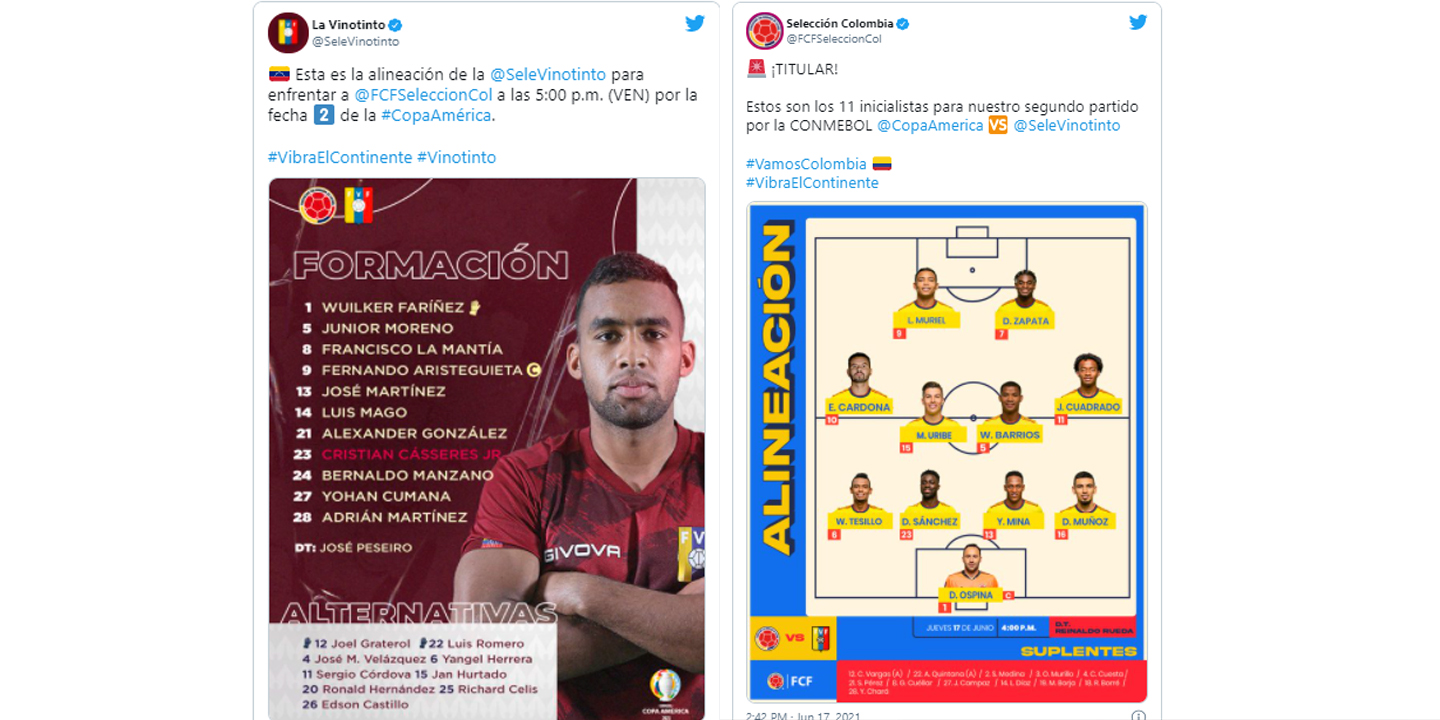 En el estadio Olímpico Pedro Ludovico Teixeira, la Selección de Colombia jugó su segundo partido de Copa América 2021, enfrentando a su similar de Venezuela. En su once inicial tuvo a David Ospina, Daniel Muñoz, Yerry Mina, Davinson Sánchez, William Tesillo, Juan Cuadrado, Wilmar Barrios, Matheus Uribe, Edwin Cardona, Luis Muriel y Duvan Zapata. Durante el duelo, la Selección de Colombia realizó cambios en el tiempo complementario: Jaminton Campaz y Luis Díaz por Luis Muriel y Edwin Cardona (61″), y Miguel Borja por Duván Zapata (72″)