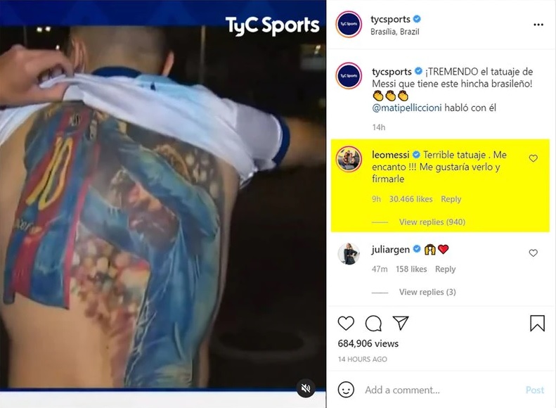 La secuencia del sueño cumplido desde el otro lado: @MatiPelliccioni se encontró con este tremendo tatuaje de un hincha brasileño, Messi lo vio en las redes de TyC Sports y manifestó sus ganas de firmarlo. ¡ACÁ ESTÁ! pic.twitter.com/C9FCZSTyGJ