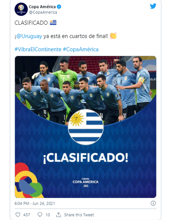Con la victoria, Uruguay llegó a cuatro puntos en el Grupo A y consiguió su pase a cuartos de final de Copa América 2021. Su último partido de fase de grupos será este lunes 28 de junio a las 7:00 de la noche en el estadio Olímpico Nilton Santos ante Paraguay, que perdió ante Argentina el pasado lunes.