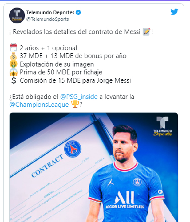 También, Messi percibirá un sueldo de 50 millones de euros (37 millones de sueldo más 13 millones como bono), aparte de que PSG podrá hacer uso de la imagen del argentino, quien firmó por dos años, con opción a un tercero.