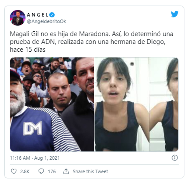De acuerdo con Ángel de Brito, Magali Gil no es hija de Diego Armando Maradona, debido a que se hizo una prueba de ADN, con muestras de una hermana del “Diez” y se encontró que había “baja probabilidad de vínculo”.
