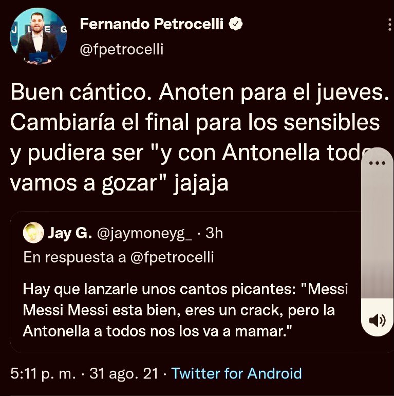 “Buen cántico”, escribió Petrocelli en un tuit de respuesta.