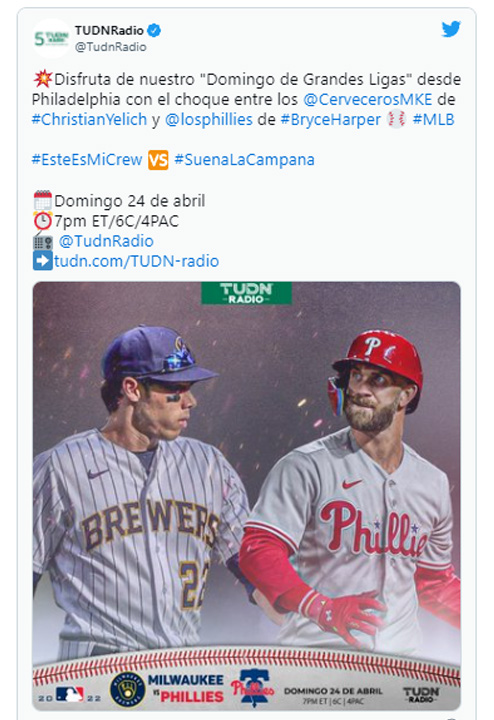 Hasta el momento, TUDN solo transmite partidos de MLB los domingos en TUDN Radio y este domingo estarán comentando el de Cerveceros de Milwaukee ante Phillies.