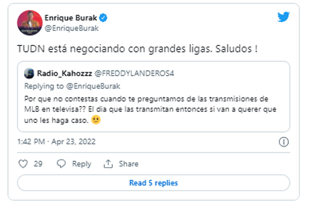 Enrique Burak respondió en Twitter que TUDN sigue con las negociaciones con la MLB.
