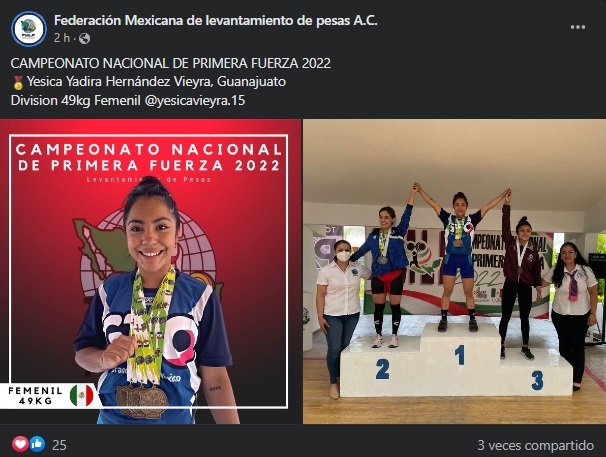 “¡Muy contenta por el resultado, selectivo al Panamericano de mayores @panampesas en Bogotá, Colombia, en julio, vamos a darlo todo por México, Guanajuato y mi querido León, gracias por su apoyo!”, publicó Hernández en sus cuentas de redes sociales.