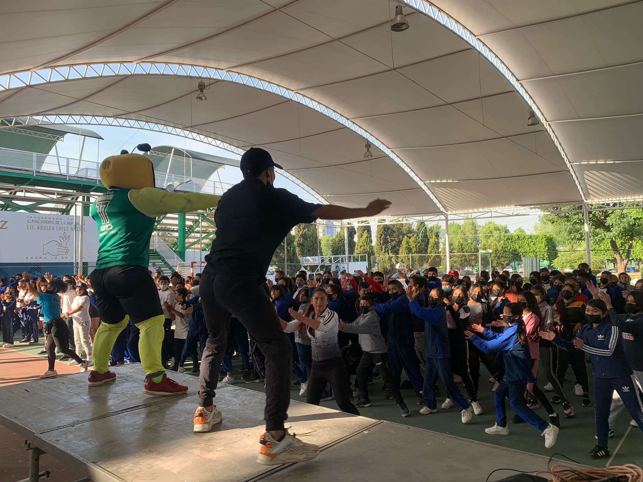 En total, en el evento participaron 21 escuelas secundarias y telesecundarias de la zona 513 y una escuela primaria de Las Joyas, quienes más o menos a las 10 de la mañana, se trasladaron a la cancha de tribunas de la deportiva para una clase de zumba que también incluyó a las mascotas de Bravos y Abejas de León.
