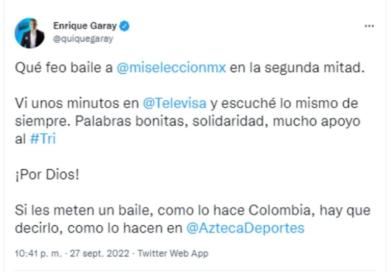 Para Enrique Garay, la Selección de Colombia le pegó “un feo baile” a la Selección Mexicana en el segundo tiempo y aseguró que vio minutos por TUDN, criticando que escuchó “lo mismo de siempre: palabras bonitas, solidaridad, mucho apoyo al ‘Tri’”.