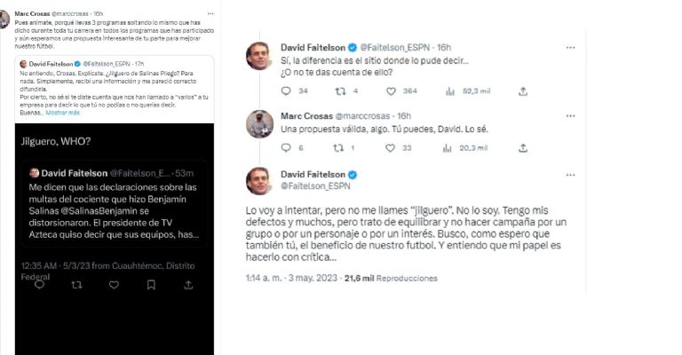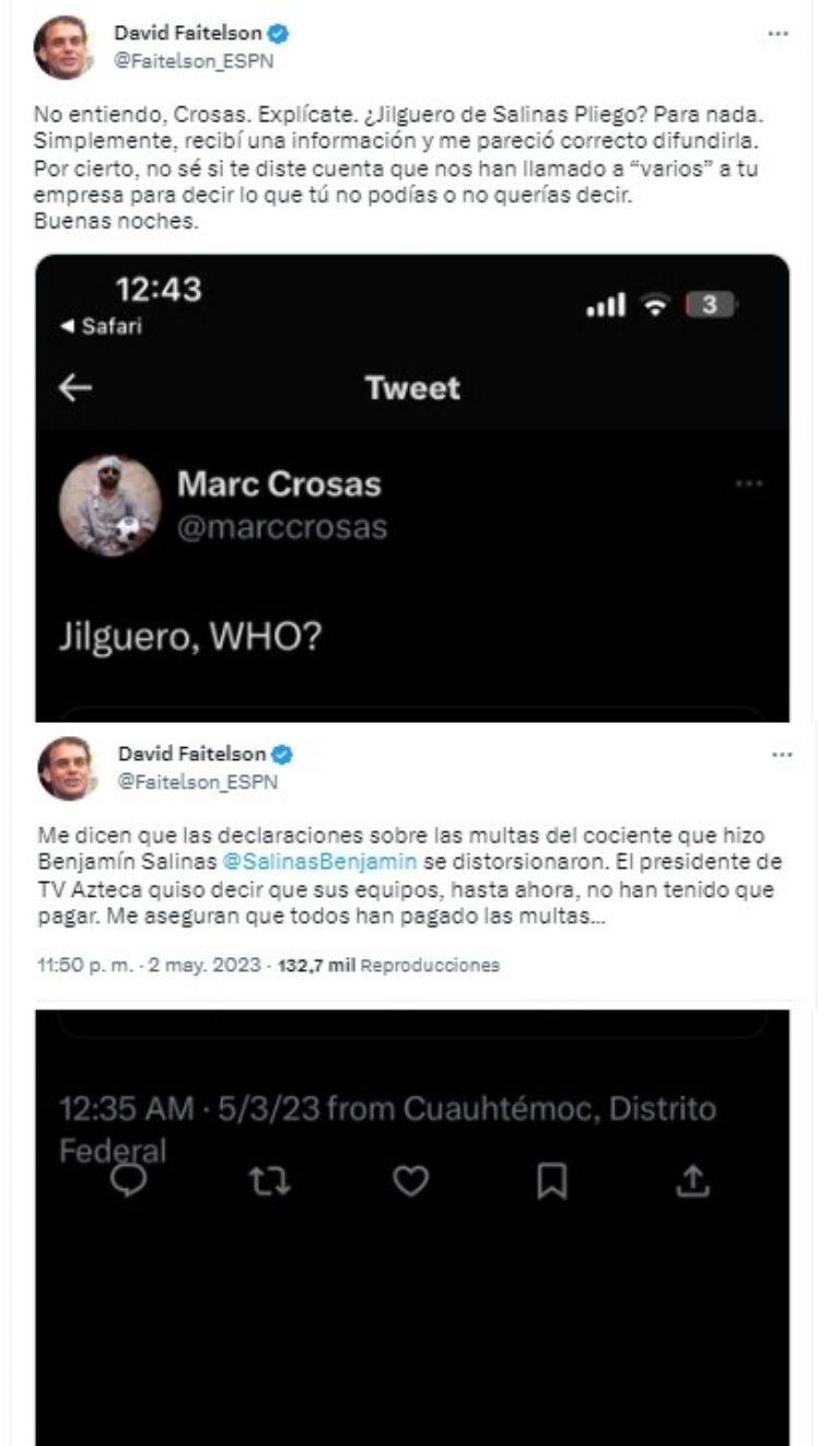 En su cuenta de Twitter, David Faitelson mencionó que le comentaron que las declaraciones de Benjamín Salinas fueron distorsionadas, porque el presidente de TV Azteca quiso decir que sus equipos eran los que no habían pagado multa, posteriormente Marc Crosas lo llamó “jilguero”.