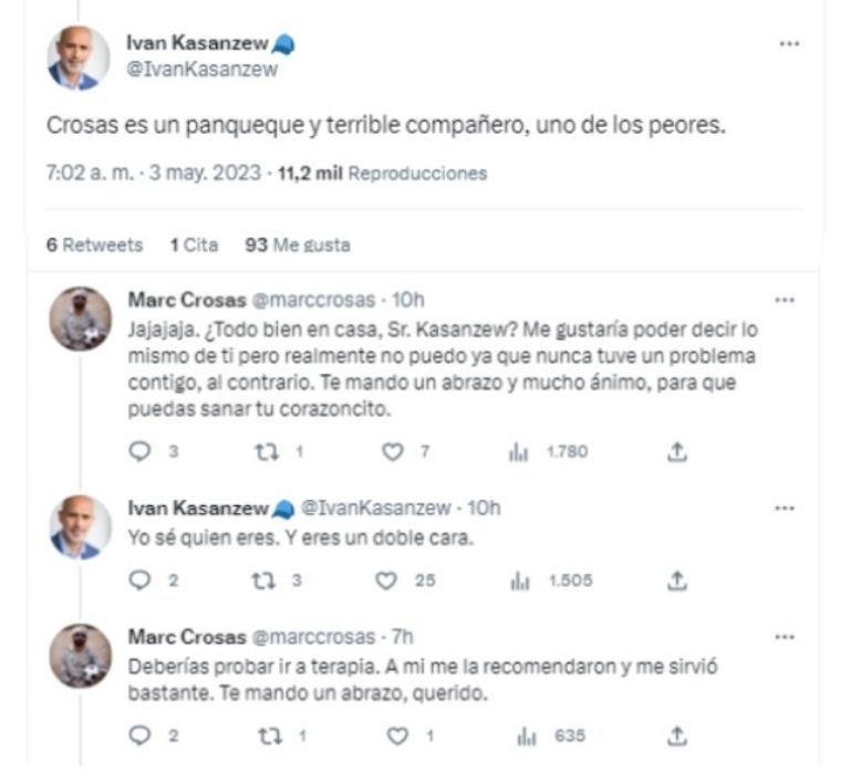 “¿Todo bien en casa, señor Kasanzew? Me gustaría decir lo mismo de ti, pero realmente no puedo, ya que nunca tuve un problema contigo, al contrario. Te mando un abrazo y mucho ánimo, para que puedas sanar tu corazoncito”, escribió Crosas.