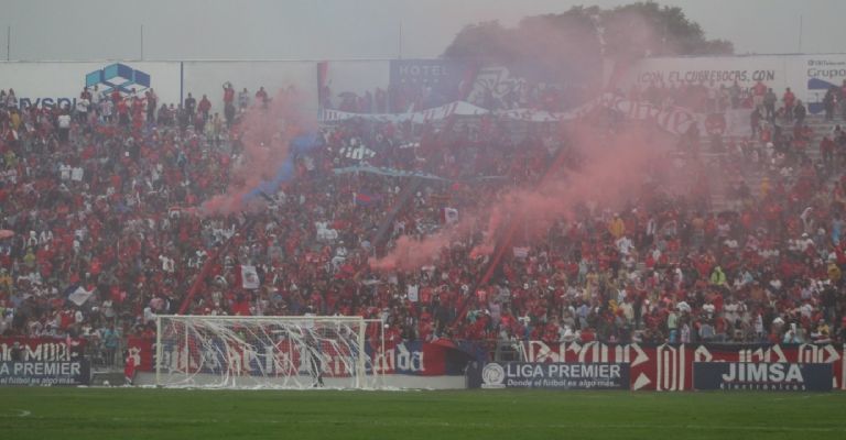 Los Hijos de la Mermelada adornaron las gradas que les fueron asignadas con listones y pendones con frases como “Los de siempre”, “Se viene por el sentimiento” o “Freseros y orgullosos”, además de alegrar el ambiente con bombas de humo rojo y azul que controlaban al ritmo de los bombos, las trompetas y las porras que aclamaron los aficionados.