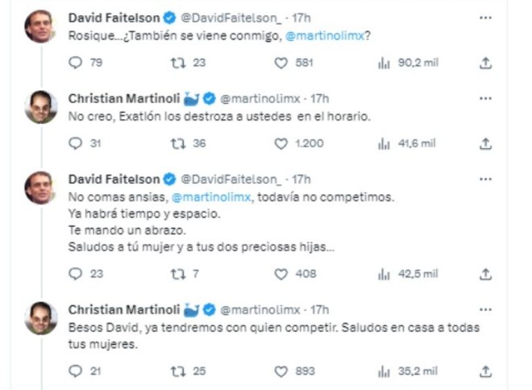 No comas ansias, Martinoli, todavía no competimos. Habrá tiempo y espacio. Te mando un abrazo”, añadió Faitelson y mandó saludos a la familia de Martinoli. “Besos David, ya tendremos con quien competir”, contestó el narrador de Azteca y también mandó saludos a la familia de David.