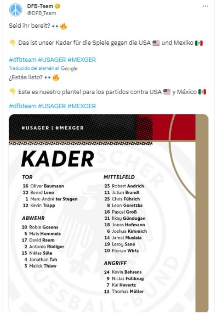 La Selección de Alemania dio a conocer a los jugadores convocados para los encuentros ante las selecciones de México y Estados Unidos.